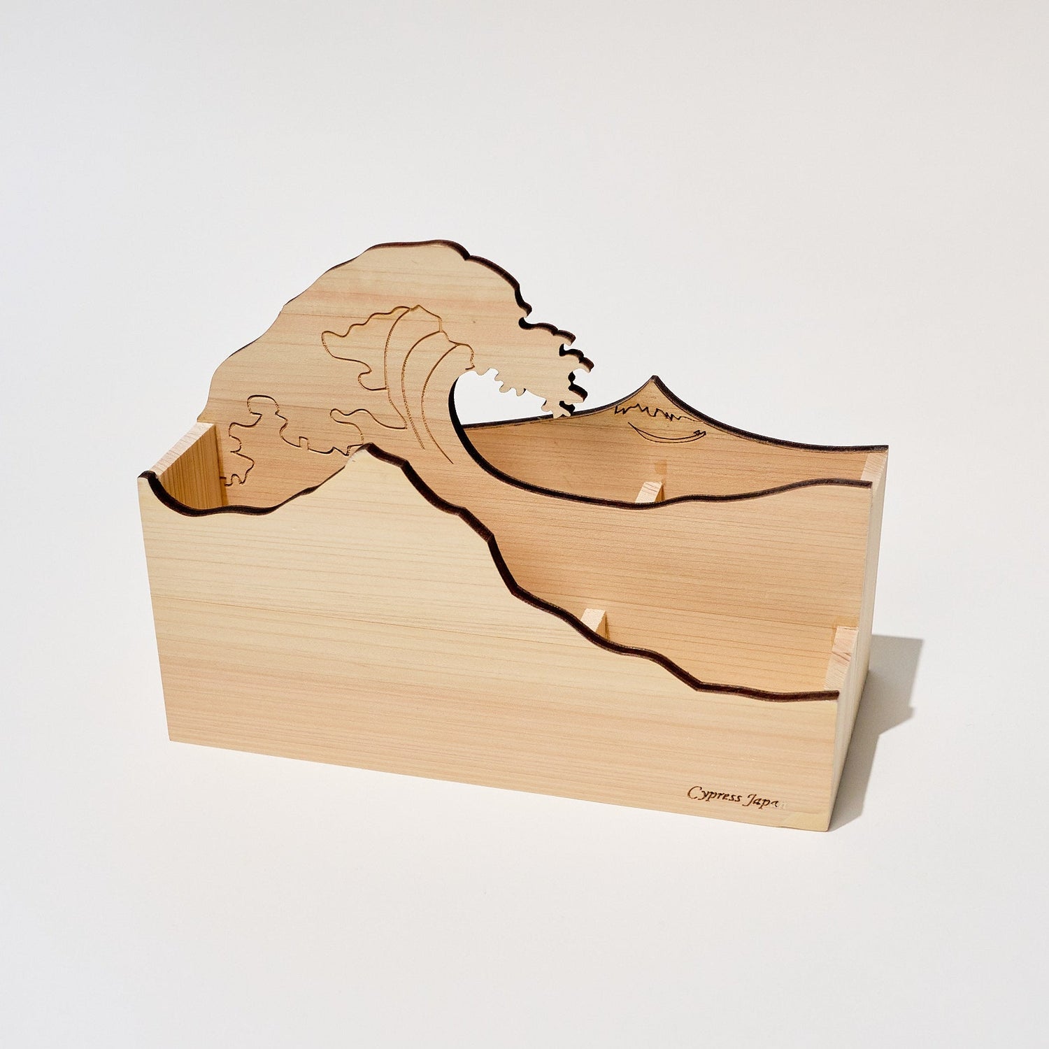 A handcrafted Japanese cypress wood desktop organizer that blends natural materials with practical storage. It holds pens, scissors, rulers, and small accessories while offering a tactile, aromatic accent to any workspace.