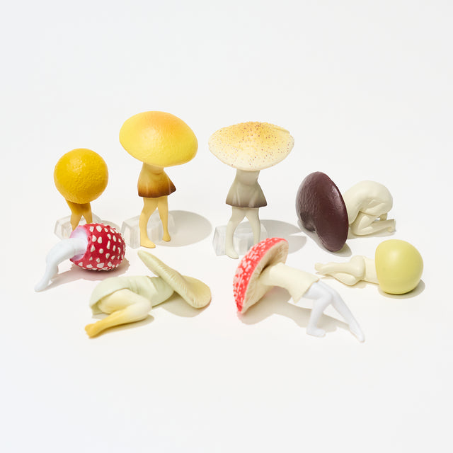 This gacha capsule collection features mushroom fairy figures in various health conditions, warning you not to ingest non-edible mushrooms.