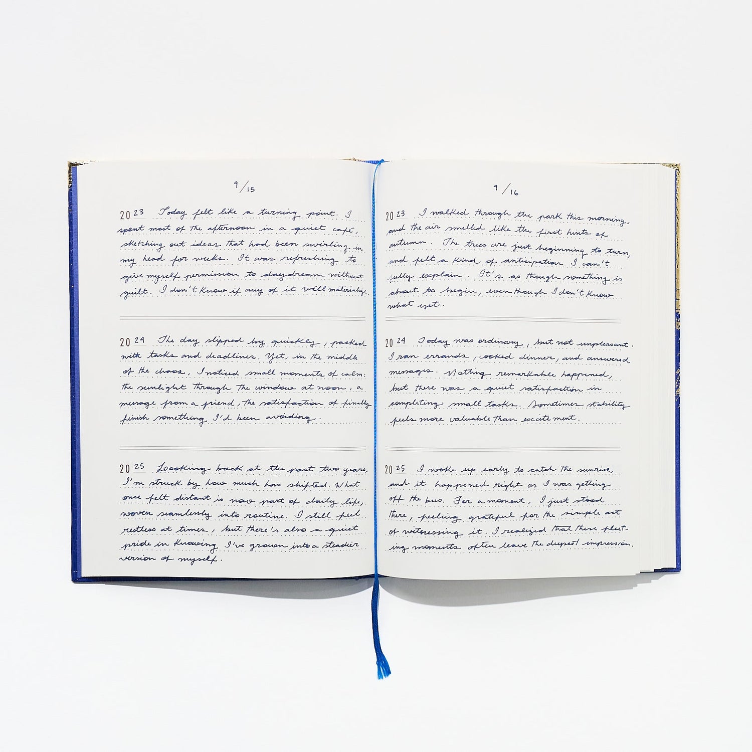 Capture your memories and track your personal growth year after year with the Ichikudo 365 3-Year Diary. This luxurious yet understated journal features a stunning embossed snakeskin pattern on its hardcover, crafted from rare overseas paper. With a calm blue tone, it blends seamlessly into daily life, while accents of silk gold leaf add a touch of elegance. Designed to help you reflect and revisit past moments, its interior layout allows you to see entries from the same day across three years, making it easy to track changes over time.