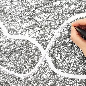 | Design Concept | Black scribble area for discarding thoughts; continuous white path for retained ideas |