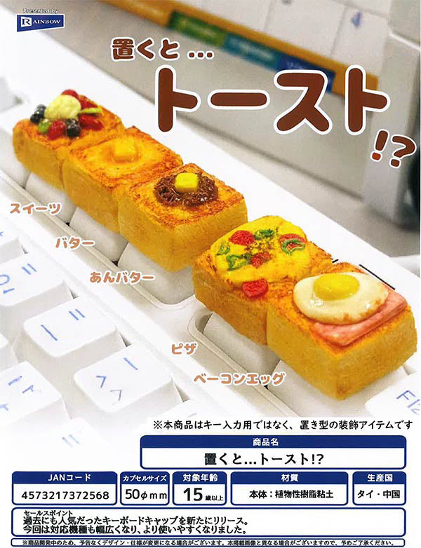 This gacha capsule collection features toast-shaped keyboard caps. Each keyboard cap is approximately 15 mm x 15 mm (internal dimensions) and 19 mm x 19 mm (outer dimensions).