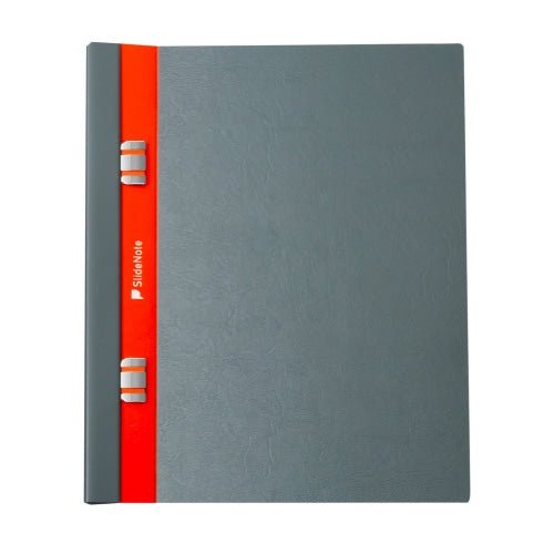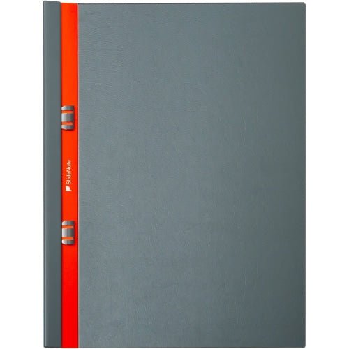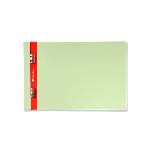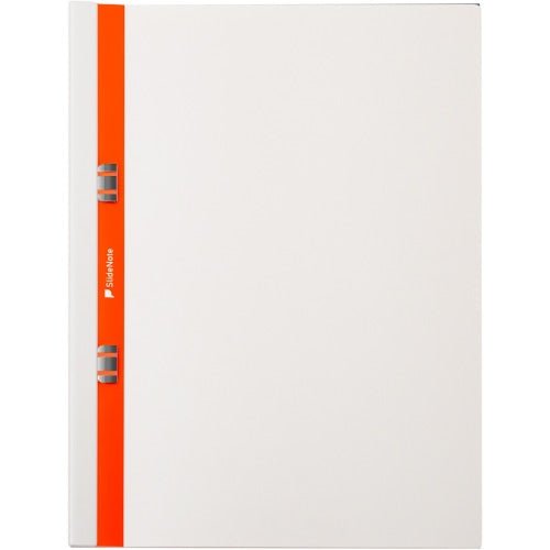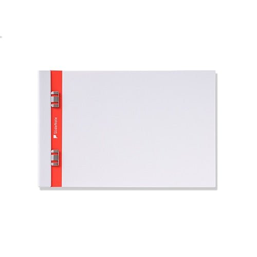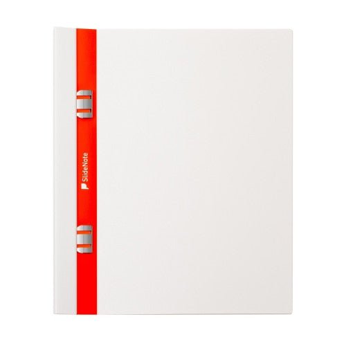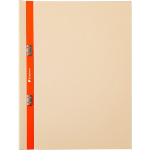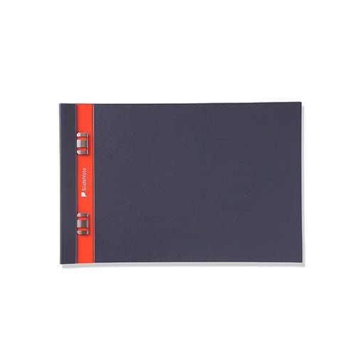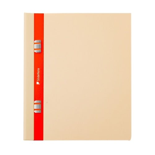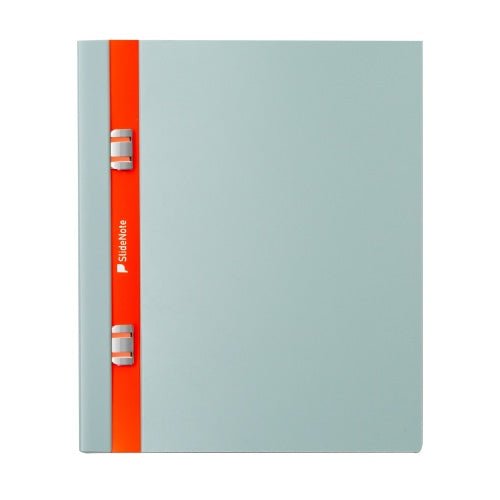 Kenkousya PageBase SlideNote is a slide-style ringless notebook featuring a metal clip mechanism that allows filing of both punched and unpunched paper. The frame slides sideways for quick insertion or removal of pages, holding even a single sheet securely with light pressure.