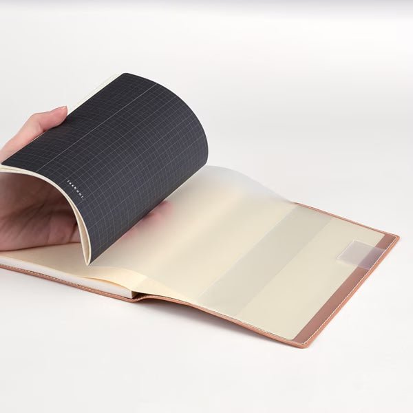 The isshoni. Insert Notebook Grid by DAIGO is designed to be used together with notebooks and planners as a compact companion. Sized smaller than standard notebooks, it slips easily into notebook covers or planner pocket sleeves. The 5mm grid layout with composition lines provides structured writing space, while the polypropylene cover features elegant gold foil stamping.
