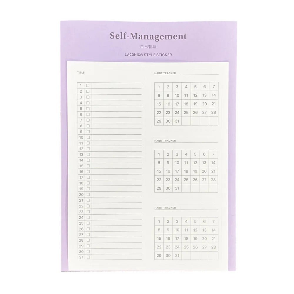 The Style Sticker by LACONIC is a sticker tool series designed to attach to notebooks, planners, and scheduler notebooks. The slender format fits easily into notebook pockets, bag compartments, inside planner covers, desk surfaces, and case exteriors, keeping frequently used stickers accessible. Each set includes 12 sticker sheets with 7 carefully selected format types, including formation notes, planning memos, circle graphs, radar charts, and self-management layouts.