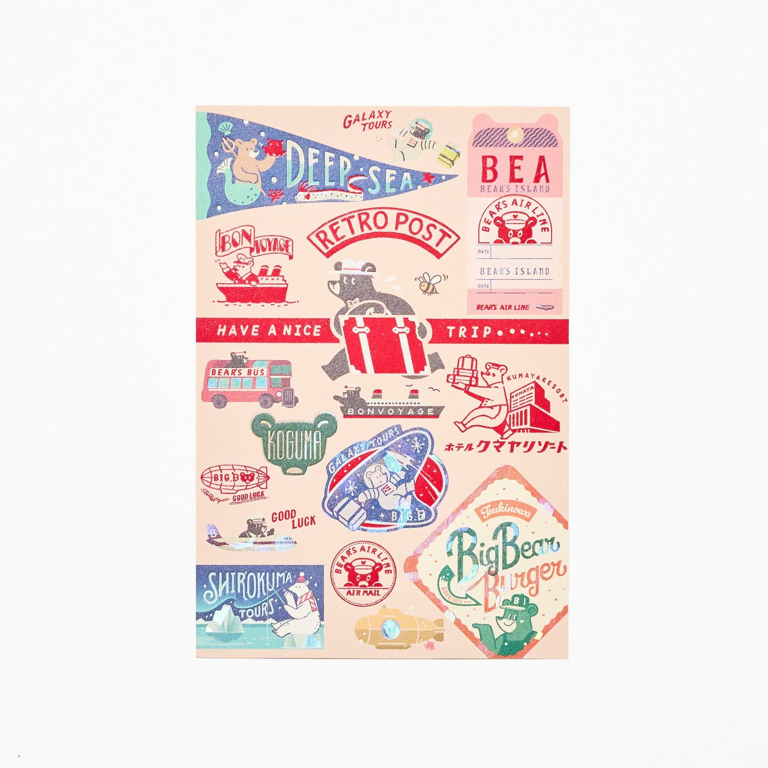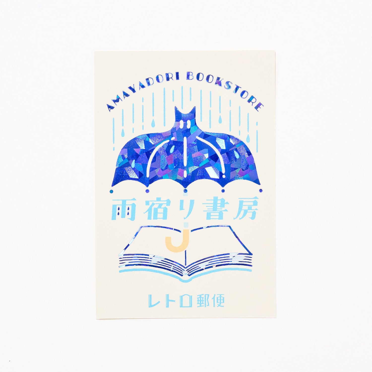 A foil-stamped postcard created through a collaboration between illustrator ob1toy (オビワン) and Kyoto-based foil-stamping brand ROKKAKU. Part of the beloved Retro Postal series, this postcard features nostalgic illustrations enhanced with richly layered foil that shimmers beautifully as it catches the light.