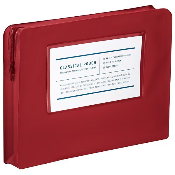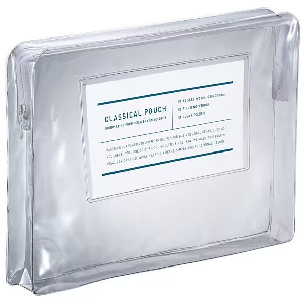 The Classical Pouch has a retro design and feel, replicating document holders used in offices and factories. The address card holder has a modern design, making it a fusion of retro and modern styles. The pouch has a gusset, allowing for more space for items. The zipper also allows for secure storage.