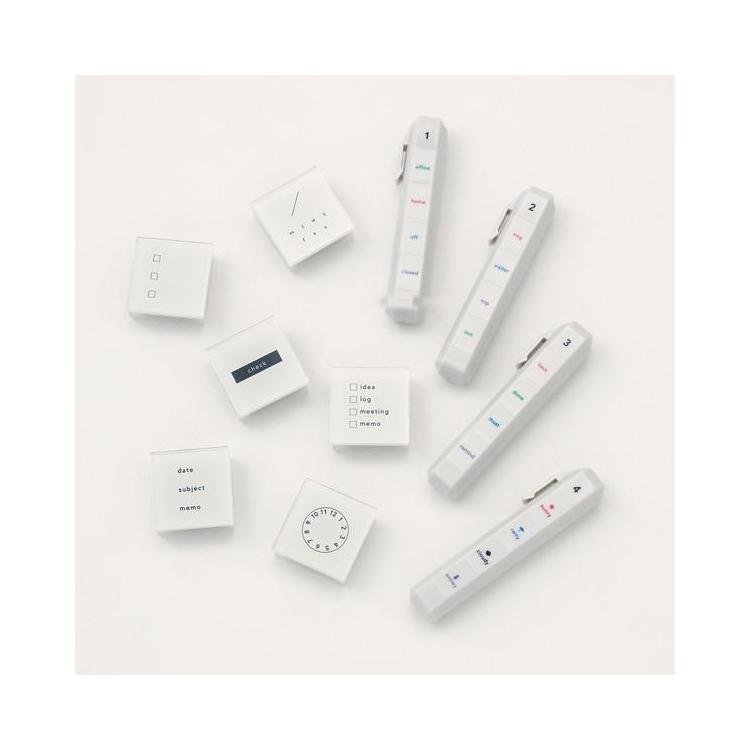 The isshoni. Point Stamp Stick by DAIGO brings convenient self-inking stamps to your pen case for marking repeated content in notebooks and planners. This stick-type stamp requires no ink pad and holds four themed designs on a single portable stick that fits alongside your pens. Each stamp is separated by theme for easy access to frequently used titles and items, with approximately 1000 impressions per stamp before disposal.