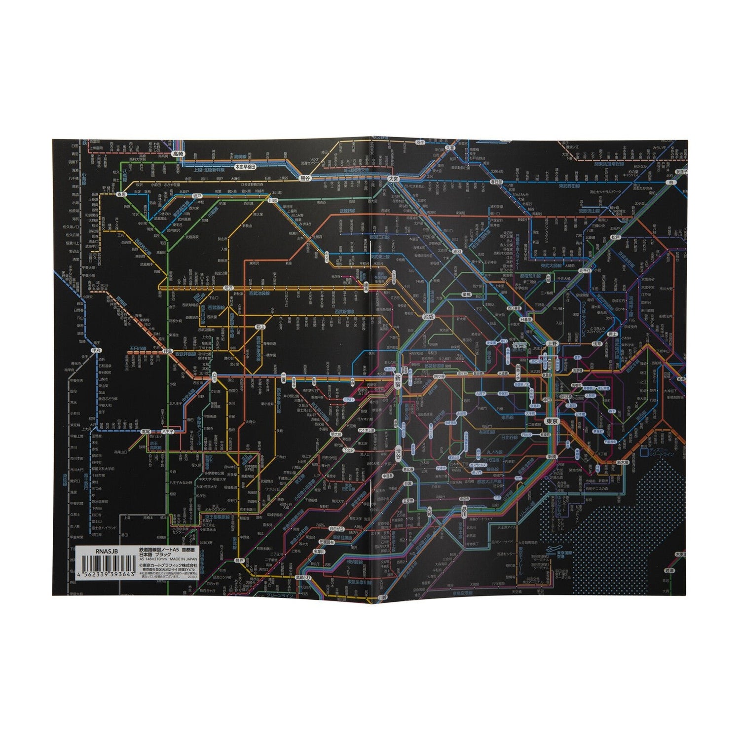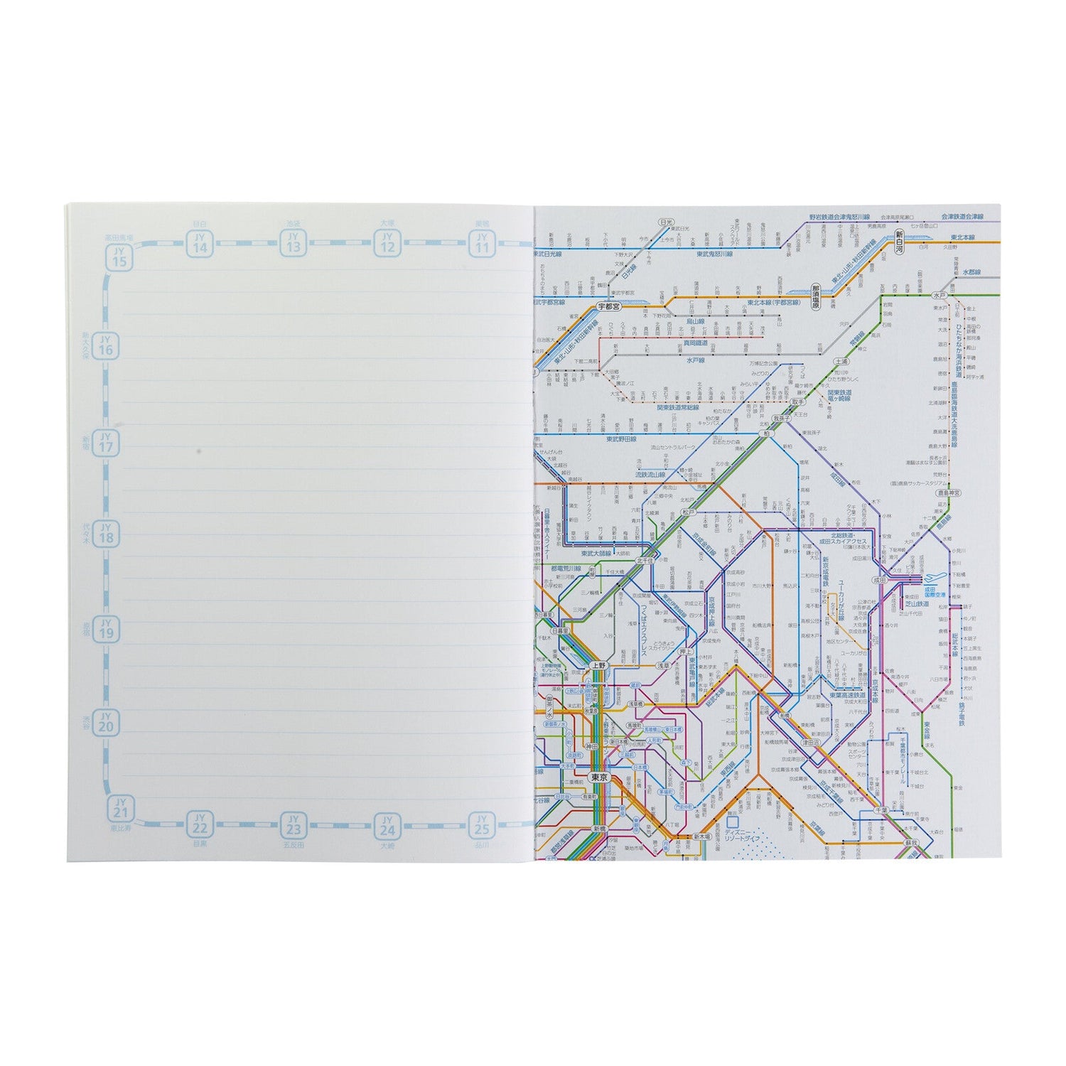 The Railway Route Map Notebook A5 Tokyo Metropolitan Area by Tokyo Cartographic features detailed railway route maps of the Tokyo metropolitan area including JR, private railways, subways, and monorails. The cover displays the route map design, and the inside cover continues the route map pattern. The notebook section contains station names along the entire Yamanote Line loop. The cover has a matte PP coating for enhanced texture and durability.